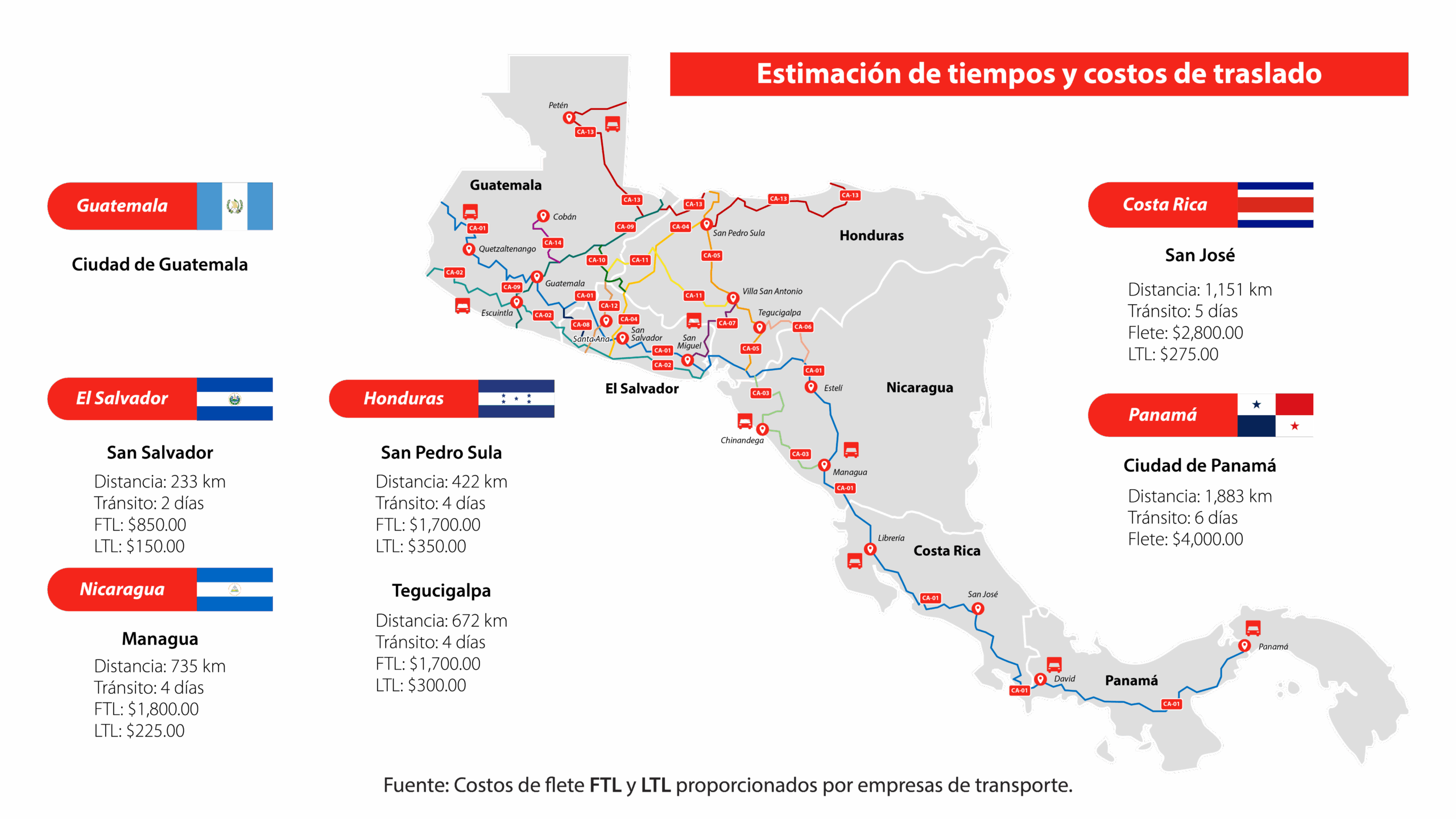 Según datos de AGEXPORT (pág. 8), una carga que sale desde Ciudad de Guatemala hacia Ciudad de Panamá puede tomar hasta 6 días de tránsito, recorrer 1,883 km, y costar aproximadamente $4,000 en flete completo (FTL). Si bien la distancia y el tiempo son predecibles, los eventos en ruta no lo son.